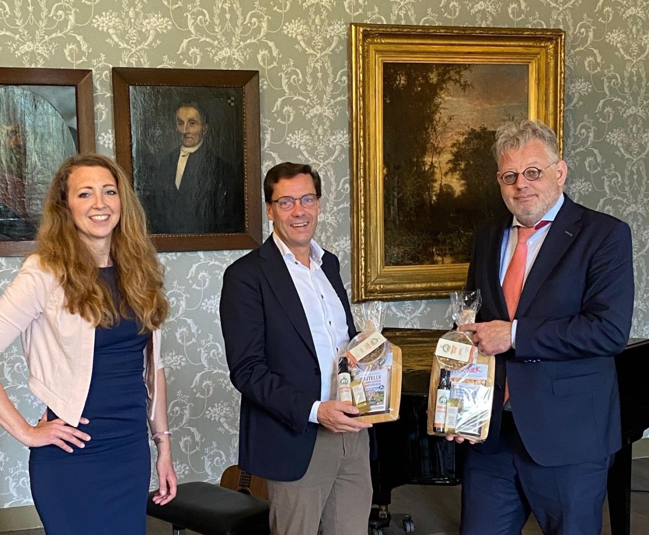Foto: Gedeputeerde Peter Drenth en wethouder Henk Bulten ontvangen de nieuwe kaart en brochure van Marcella de Vos bij Kasteel Hackfort.