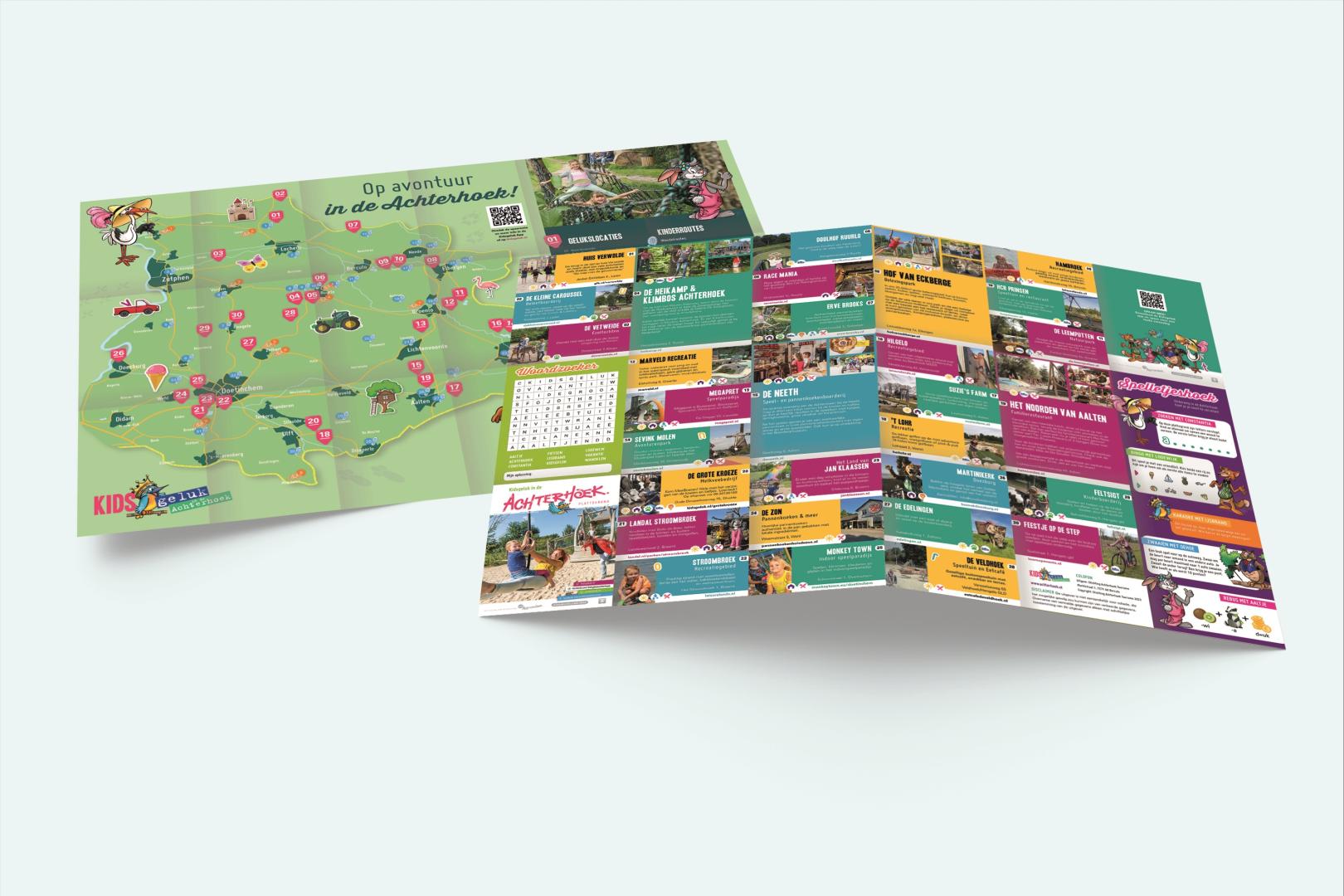 De kinderplattegrond van de campagne Kidsgeluk in de Achterhoek heeft een restyling doorgemaakt. De plattegrond is nu nog overzichtelijker voor de ouder en nog aantrekkelijker voor de kids. Zo heeft de plattegrond en eigentijdse uitstraling gekregen en zijn iconen toegevoegd die er voor zorgen dat nog duidelijker is bij welke attractie je bijvoorbeeld terecht kunt met slecht weer. Voor de kinderen zijn leuke spelletjes toegevoegd met de Achterhoekse dierenvrienden van Kidsgeluk.